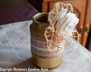I spray painted this old pickle jar gold. Then when I was happy with it; I wrapped burlap ribbon around it. I also wrapped jute around the top. Then designed this ribbon rose for the front. I used some large opened rope like ribbon to make the wide part around the ribbon rose.